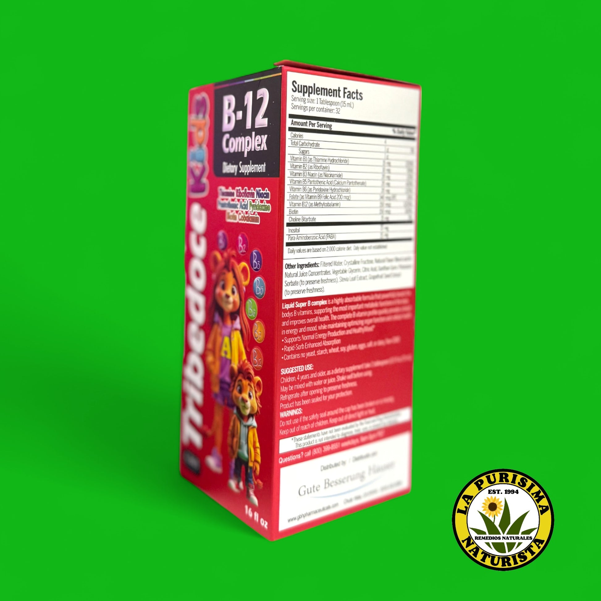 Tribedoce Kids B-12 Complex is an internal-use children's supplement in liquid form, featuring B-complex vitamins (B1, B2, B3, B6, B7, B9, B12) and choline bitartrate. This formula supports neurological development, physical energy, school performance, and overall wellness in children. Its pleasant taste makes daily intake easy and enjoyable. Ideal to complement a balanced diet with essential nutrients that help promote healthy growth and optimal nervous system function.